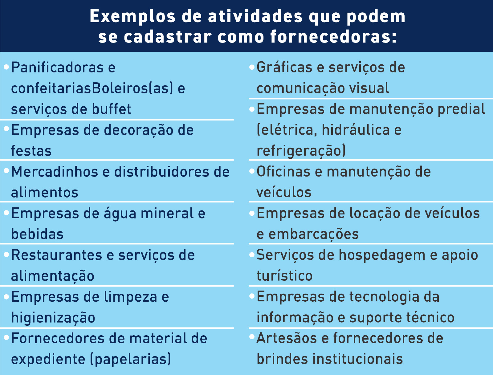 Entre as oportunidades já existentes para participação das empresas, estão processos relacionados ao fornecimento de gêneros alimentícios, além de credenciamentos para transporte marítimo e hospedagem em pousadas destinadas a servidores e colaboradores em atividade na ilha. Outros serviços e produtos também poderão ser ofertados por empresas locais, desde que estejam devidamente cadastradas nos sistemas oficiais do Estado.