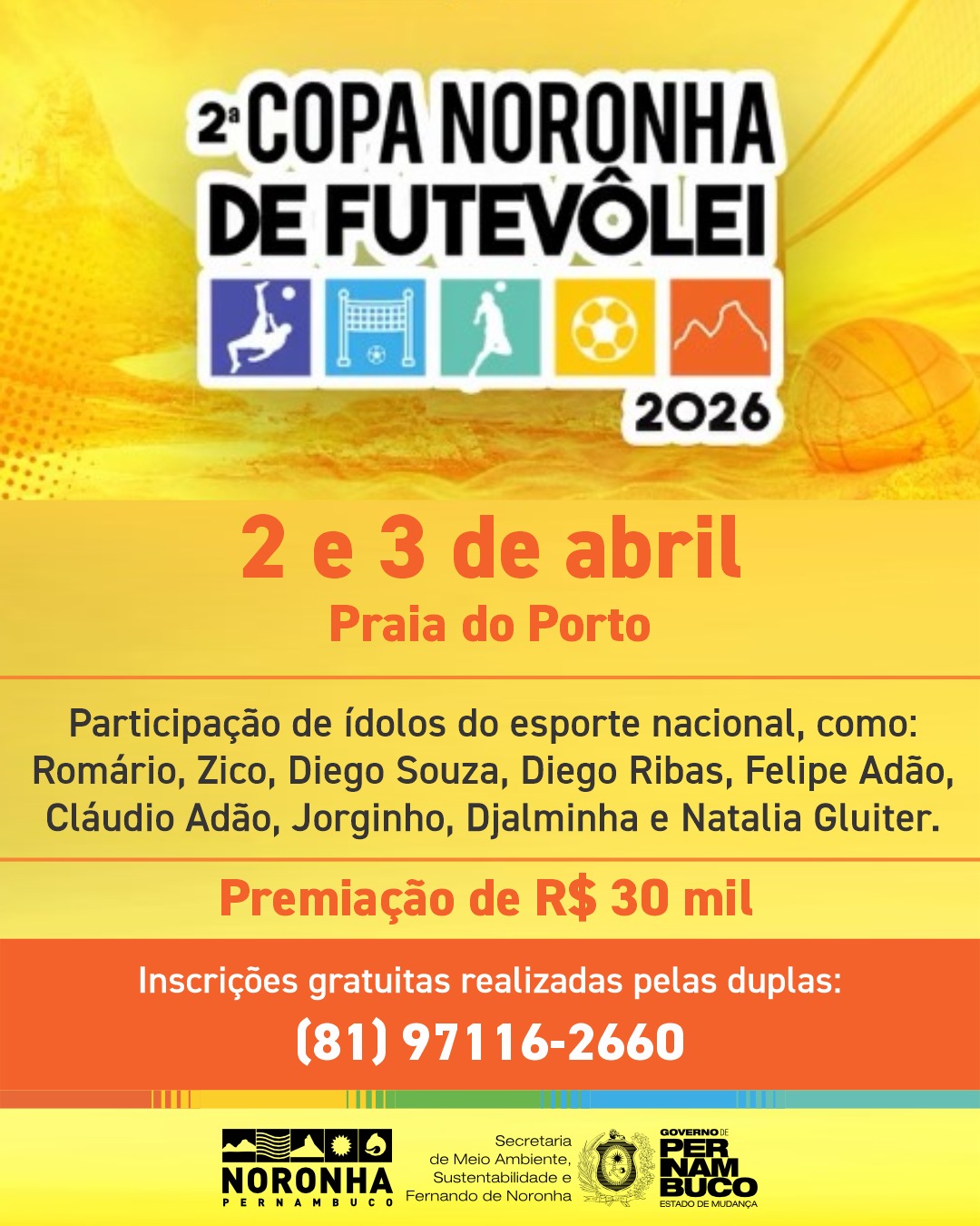 A Administração de Fernando de Noronha realiza, nos dias 2 e 3 de abril, na Praia do Porto, a 2ª Copa Noronha de Futevôlei, evento que já se consolida no calendário esportivo do arquipélago.