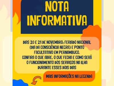 Nesta quinta-feira, 20 de novembro, é comemorado o Dia da Consciência Negra e é feriado nacional. A Secretaria de Administração informa que, por determinação do Governo do Estado, a sexta-feira, dia 21, será ponto facultativo. A medida vale para todos os órgãos e entidades da administração direta e indireta de Pernambuco, inclusive Fernando de Noronha, onde apenas os serviços...